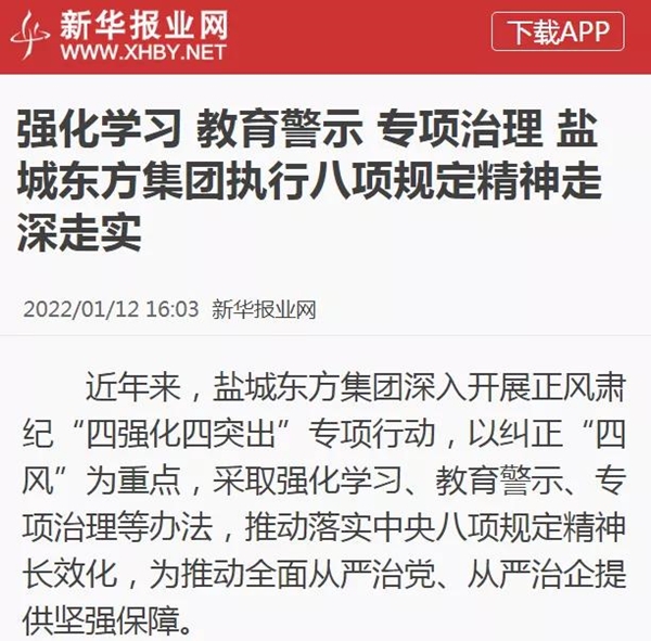 112日,新華報業(yè)網(wǎng)關(guān)注報道鹽城東方集團落實中央八項規(guī)定精神長效化重要舉措。