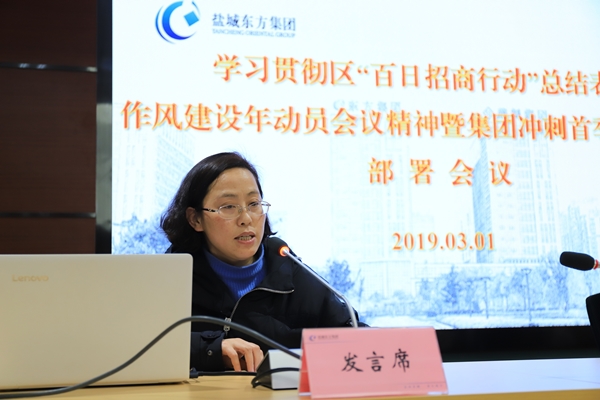 3月1日,鹽城東方集團(tuán)召開學(xué)習(xí)貫徹區(qū)“百日招商行動(dòng)”總結(jié)表彰、作風(fēng)建設(shè)年動(dòng)員大會(huì)精神暨集團(tuán)沖刺首季“開門紅”部署會(huì)議。集團(tuán)黨委書記、董事長張振國傳達(dá)學(xué)習(xí)區(qū)“百日招商行動(dòng)”總結(jié)表彰會(huì)議精神,全面部署2019年重點(diǎn)工作,號召和動(dòng)員集團(tuán)上下大干當(dāng)前、力奪首季開門紅,推動(dòng)集團(tuán)高質(zhì)量發(fā)展走在蘇北蘇中同類國企前列。集團(tuán)副黨委書記、副董事長、總經(jīng)理王旭東主持會(huì)議。集團(tuán)領(lǐng)導(dǎo)班子全體成員,各部門、子公司中層以上人員參會(huì)。