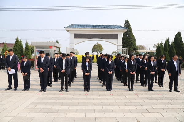 午后的陵園,陽光灑落,透著絲絲溫暖。革命烈士紀念碑在蒼松翠柏的映襯下顯得格外莊嚴肅穆。全體人員整齊列隊,懷著對革命先烈的敬仰和緬懷之情默哀3分鐘,以表達后輩人對革命先烈們的無限追思和感恩。