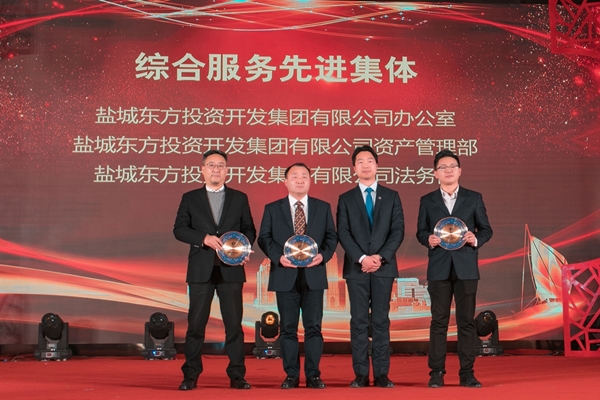 鹽城東方集團黨委書記、董事長張振國為“綜合工作先進集體”代表頒獎。