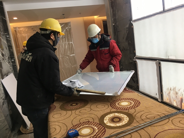在確保做好防疫工作的前提下,燕舞·亞朵酒店實(shí)行優(yōu)化施工管理,細(xì)化各項(xiàng)工作安排,精細(xì)劃分人員作業(yè)區(qū)域與人員配備標(biāo)準(zhǔn),采取“分層、分段、分間”的施工組織模式,減少交叉作業(yè),避免人員在某一區(qū)域聚集。當(dāng)前,各項(xiàng)施工任務(wù)正穩(wěn)步推進(jìn)。酒店走廊區(qū)域,施工人員開(kāi)始安裝燈箱裝飾畫(huà);酒店房間內(nèi),恢復(fù)墻紙裱糊工作;酒店地面,進(jìn)行大理石鏡面處理;酒店樓頂,進(jìn)入空氣能調(diào)試階段;固裝家具待上游廠商恢復(fù)供貨后將陸續(xù)進(jìn)場(chǎng)安裝。