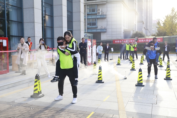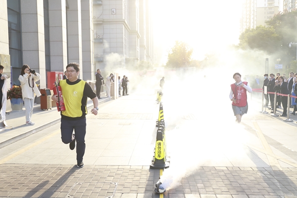 15:00分,隨著集團大樓火警鈴聲的響起,集團各部門、子公司人員在物業(yè)客服人員的引導(dǎo)下,口捂濕毛巾從各樓層安全通道低聲有序撤離至亞朵酒店門前廣場,參加本次宣傳日專題活動。