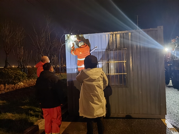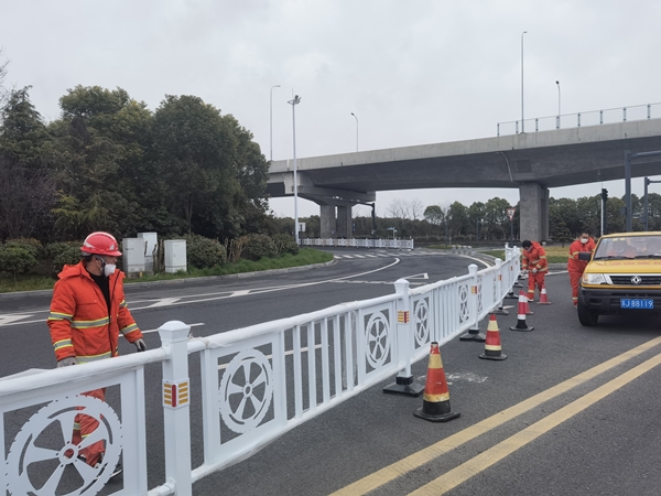 “護欄設(shè)置組抓緊到崗到位,立即封閉道路分流車輛;施工保障組趕快調(diào)撥功能用房并快速安裝,保障通水通電;登高作業(yè)組趕緊全員作業(yè),保證監(jiān)控設(shè)備應(yīng)裝盡裝……”東方安通公司市政設(shè)施維護處負(fù)責(zé)人張輝在漓江路現(xiàn)場統(tǒng)籌調(diào)度,30余名施工人員和10多臺工程車輛馬力全開,在凜冽寒風(fēng)和雨水中,構(gòu)成了一幅熱火朝天的搶工會戰(zhàn)圖。