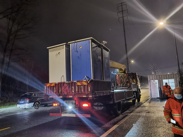18日夜,東方安通公司身著“熒光橙”和“紅馬甲”的施工隊伍到達(dá)施工點位后分組突擊、統(tǒng)籌推進,挑燈作戰(zhàn)設(shè)置隔離護欄實現(xiàn)封閉管理,布置5間帶空調(diào)的功能用房并接水接電,同步完成4座獨立衛(wèi)生間和內(nèi)部監(jiān)控系統(tǒng)。