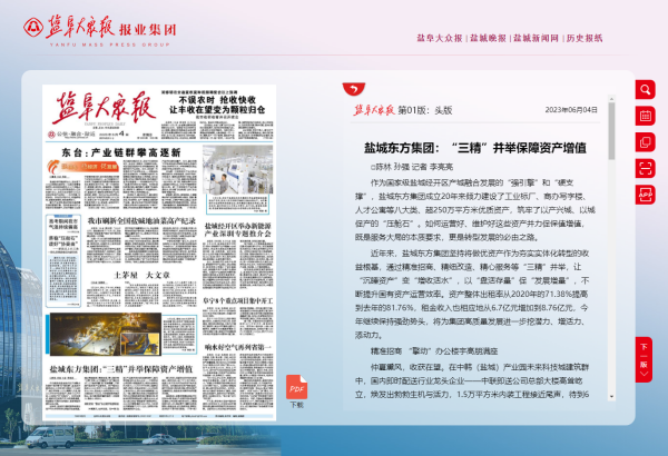 近日,鹽阜大眾報以《鹽城東方集團(tuán):“三精”并舉保障資產(chǎn)增值》為題,頭版重要位置報道了鹽城東方集團(tuán)近年來不斷優(yōu)化國有資產(chǎn)布局,改善國有資產(chǎn)管理效率與效果,有效實現(xiàn)了國有資產(chǎn)保值增值的生動實踐。