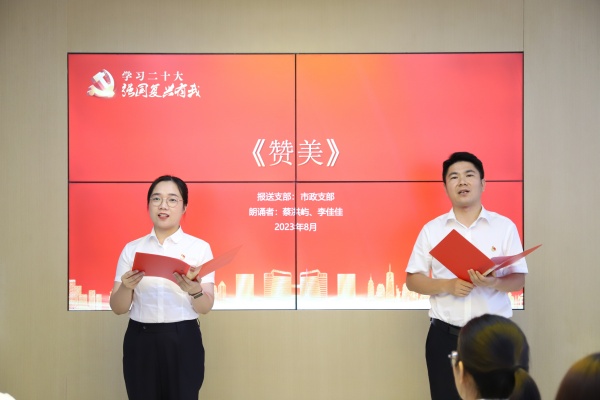 活動現(xiàn)場,代表鹽城經開區(qū)參加全市“貫徹二十大 奮進新征程”主題宣講比賽并榮獲“二等獎”的集團青年宣講組合周毅、張勇為大家?guī)砹酥黝}宣講《致敬新時代、奮進新征程》,宣講聲情并茂、深入人心,讓大家在誦讀聲中感受新時代的脈搏,在傾聽中辨別新征程的方向,著力激發(fā)青年員工在奮力推進中國式現(xiàn)代化新征程上的使命任務與責任擔當!