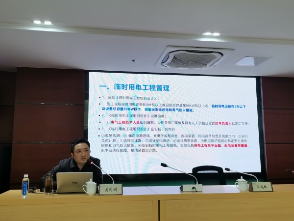 本次專題培訓(xùn)主要針對施工現(xiàn)場臨時用電安全。吳同洲首先介紹了施工現(xiàn)場臨時用電相關(guān)的法律依據(jù)、國家標(biāo)準(zhǔn)和行業(yè)標(biāo)準(zhǔn),施工現(xiàn)場臨時用電安全技術(shù)規(guī)范的出臺歷程及背景和意義。隨后,就臨時用電工程管理、三級配電兩級保護(hù)、TN-S系統(tǒng)、接地與防雷、配電設(shè)施及線路工程等六大方面進(jìn)行系統(tǒng)講解分析,講解緊密結(jié)合實(shí)際工程,通過大量典型案例分析清晰說明實(shí)際工程中臨時用電方面常見的錯誤做法、不規(guī)范施工、不安全設(shè)施設(shè)備等安全隱患及對應(yīng)的整改措施和標(biāo)準(zhǔn)做法。在場人員共同觀看了事故警示教育片,片中對典型安全事故案例進(jìn)行深入剖析,并對安全事故發(fā)生后現(xiàn)場緊急處置方法進(jìn)行動畫教學(xué)。