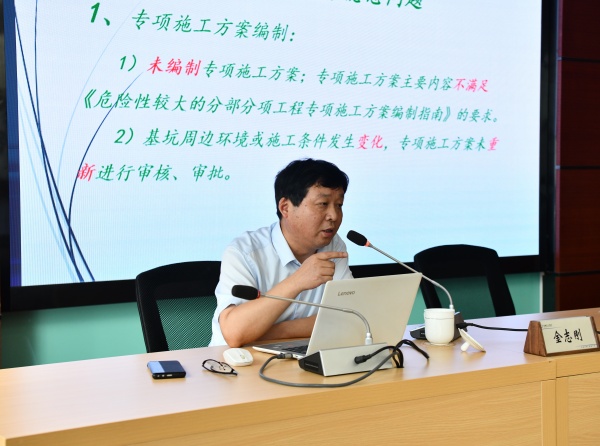 培訓(xùn)會(huì)上,金志剛首先就基坑工程隱患分類進(jìn)行了詳細(xì)解釋,其次就工程實(shí)體中常見(jiàn)的基坑支護(hù)、降排水、基坑開(kāi)挖、坑邊荷載、安全防護(hù)、基坑監(jiān)測(cè)、支撐拆除、作業(yè)環(huán)境等8種隱患類型進(jìn)行風(fēng)險(xiǎn)分析并提出具體對(duì)應(yīng)措施;隨后就建筑消防隱患種類、動(dòng)火作業(yè)、消防整治重點(diǎn)等方面并結(jié)合鎮(zhèn)江市“3.8”、徐州市“12.2”建筑施工火災(zāi)等典型案例進(jìn)行系統(tǒng)講解,會(huì)議觀看了建筑施工火災(zāi)事故警示教育片。