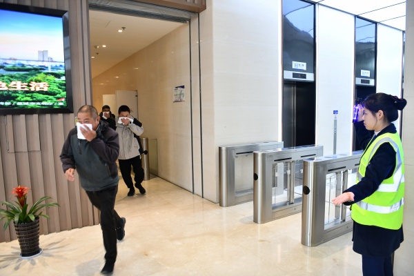 隨著大樓內(nèi)消防警鈴和廣播聲的響起,集團各樓層人員在現(xiàn)場疏散人員的指揮下,沿電梯廳前室處疏散樓梯撤離到室外廣場集中,由各部門負責(zé)人清點人員并上報總指揮。