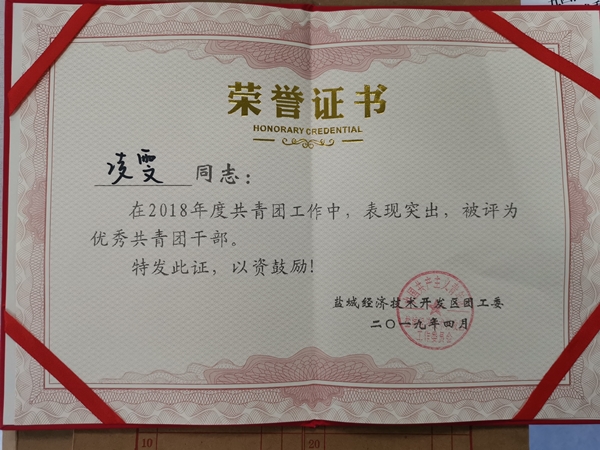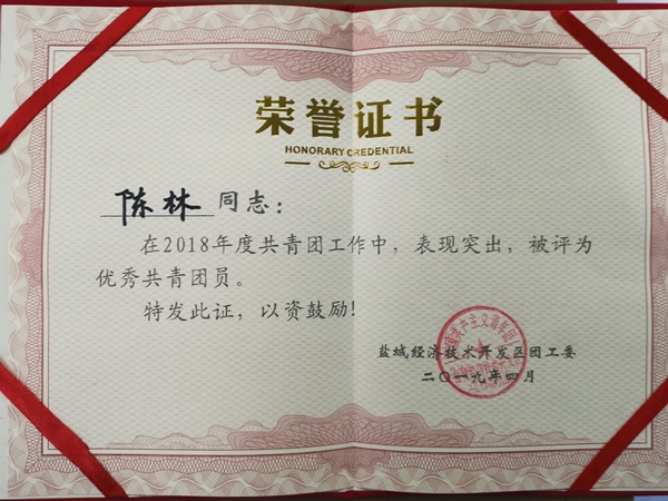 陳林同志榮獲“2018年度區(qū)優(yōu)秀共青團(tuán)員”。