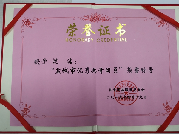 沈潔同志榮獲“2018年度鹽城市優(yōu)秀共青團(tuán)員”。