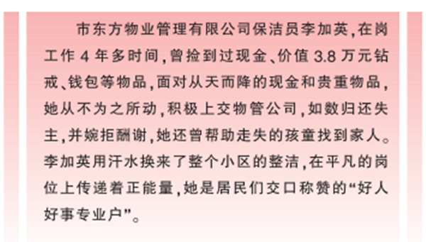 李加英撿到貴重物品和現(xiàn)金可不是第一次。前年夏天的一天上午,李加英在打掃露天菜場時撿到一只錢包,內(nèi)有銀行卡、身份證和1000多元現(xiàn)金。李加英站在原地等失主,她試著向路人打聽是否有人丟了錢包。“你看看身上差不差東西?”李加英細(xì)聲問站在路邊買菜的陳女士。“不差。”陳女士爽快地回答道。“你再仔細(xì)看看,摸摸口袋。”“不好,我的錢包丟了,包里的銀行卡里有10萬塊的存款呢,還有1000多塊錢的現(xiàn)金。”陳女士摸了摸褲口袋,急忙開始找錢包。在眾人的見證下,陳女士認(rèn)領(lǐng)了錢包。錢包失而復(fù)得,陳女士對李加英充滿了感激,多次向物管主任提起此事,要求表彰李加英。