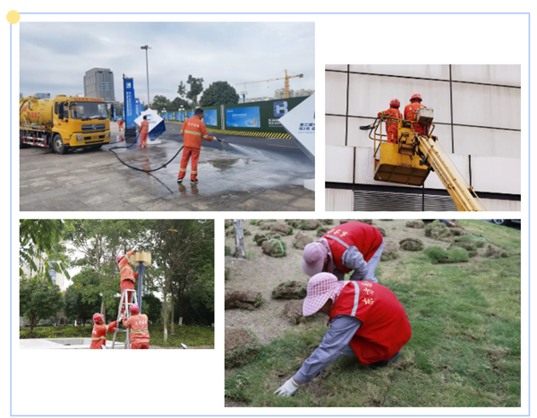 做細(xì)做實(shí)氛圍營(yíng)造,以最美的環(huán)境迎接四方賓客。東方安通提升改造會(huì)展中心外側(cè)施工圍擋、場(chǎng)館外側(cè)道路及城市亮化設(shè)施,對(duì)場(chǎng)館外幕墻及廣場(chǎng)外圍地面進(jìn)行細(xì)致沖洗,維護(hù)場(chǎng)館外圍整體環(huán)境潔凈;東方園林出動(dòng)300人次對(duì)會(huì)展中心東側(cè)綠化帶苗木進(jìn)行整體修剪,增植大型綠植,鋪設(shè)1700平方米草坪;圍繞會(huì)戰(zhàn)中心西側(cè)主入口核心點(diǎn)位,廣場(chǎng)花壇重點(diǎn)布置杜鵑、黃菊、一品紅等鮮花1萬(wàn)多盆,由十余名工人兩晝夜擺放完成,組成靚麗的風(fēng)景線;綠化美化保障貫穿中韓博覽會(huì)期間,清洗館內(nèi)1000多盆綠植,更換500多盆應(yīng)景花卉,高標(biāo)準(zhǔn)保持花化彩化,確保綠地整潔、環(huán)境優(yōu)美。