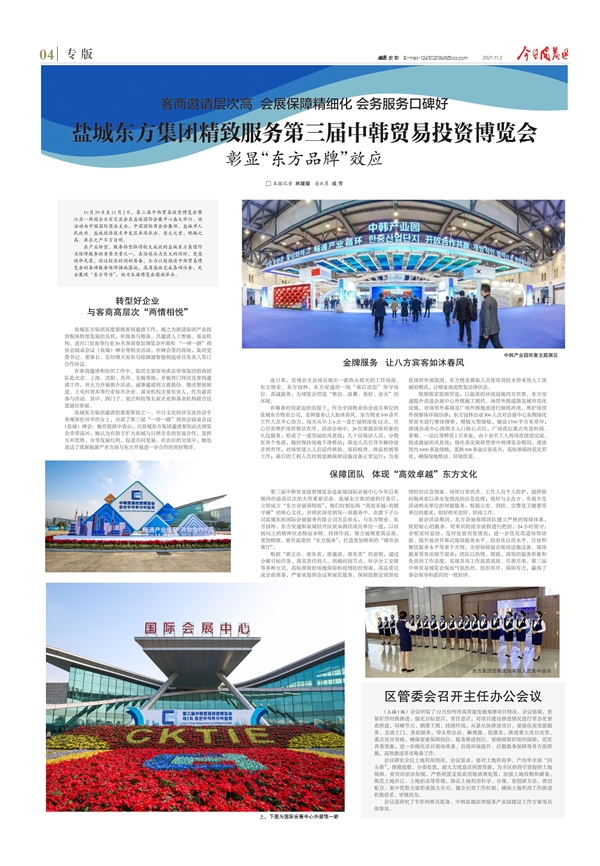 112日,今日開(kāi)發(fā)區(qū)報(bào)A4版以《鹽城東方集團(tuán)精致服務(wù)第三屆中韓貿(mào)易投資博覽會(huì) 彰顯“東方品牌”效應(yīng)》為題,整版報(bào)道了東方集團(tuán)高質(zhì)高效全力推進(jìn)服務(wù)保障中韓貿(mào)易博覽會(huì),展現(xiàn)“東方作為”的生動(dòng)寫(xiě)照。