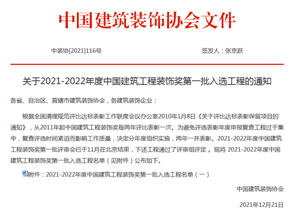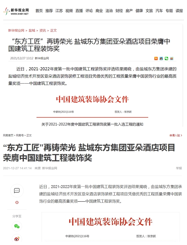 近日,2021-2022年度第一批中國建筑工程裝飾獎評選結(jié)果揭曉,由鹽城東方集團承建的鹽城經(jīng)濟技術開發(fā)區(qū)亞朵酒店裝飾裝修工程項目憑借優(yōu)秀的工程質(zhì)量榮膺中國裝飾行業(yè)的最高質(zhì)量獎項——中國建筑工程裝飾獎!