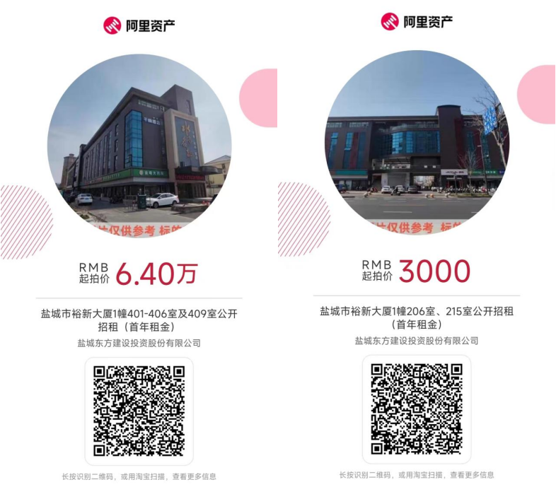 鹽城市東方融資有限公司將于2023年3月18日10時起至2023年3月19日10時止(延時除外),在阿里拍賣平臺對鹽城市裕新大廈1幢401-406室及409室,206室、215室進行公開招租,價高者得,具體為: