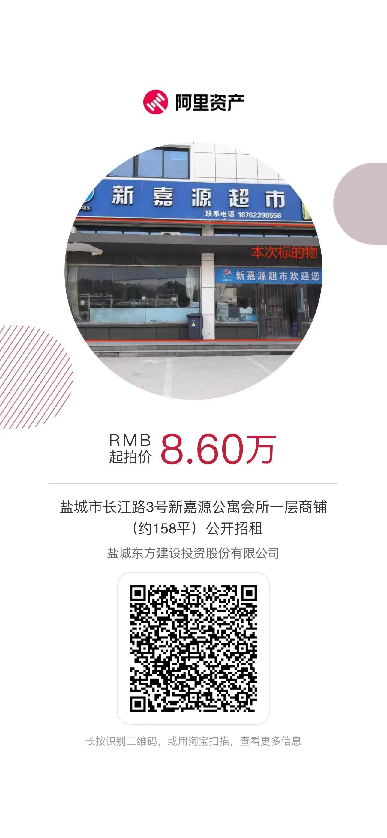 鹽城東方新天地置業(yè)有限公司將于2024年3月18日10時起至2024年3月19日10時止(延時的除外),在阿里拍賣平臺對鹽城經(jīng)濟技術(shù)開發(fā)區(qū)長江路3號新嘉源公寓會所一層商鋪(約158平)公開招租,免租期2個月,租賃起拍價:86000元/年。上述房產(chǎn)加價幅度:500元整或整倍數(shù),租賃期限3年。