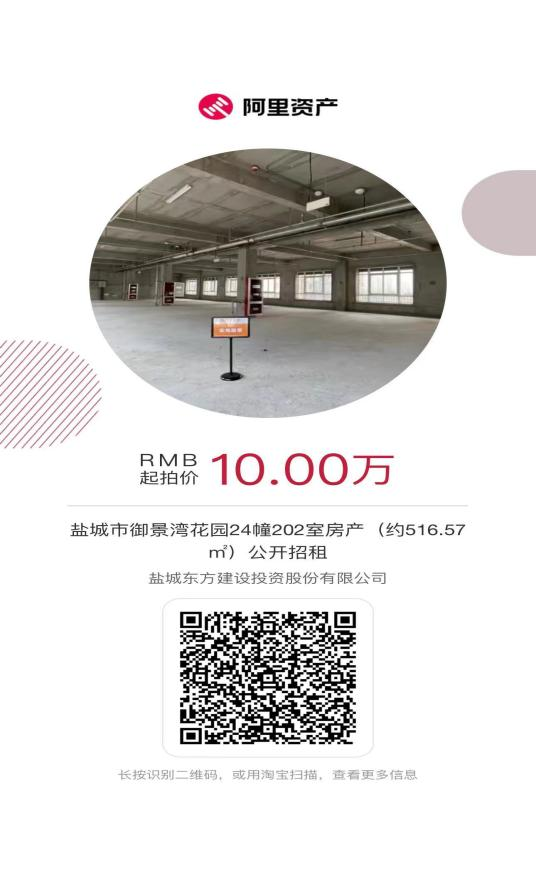 鹽城東方建設(shè)投資股份有限公司將于2024年5月4日10時起至2024年5月5日10時止(延時的除外),在阿里拍賣平臺對御景灣花園24#202室(商業(yè))進行公開招租,建筑面積516.57平方米,按現(xiàn)狀招租,免租期2個月,租賃底價:10萬元/年。加價幅度:2000元整或整倍數(shù),租賃期限為五年。